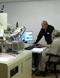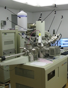 Auger Microprobe JAMP 9500F has the worlds highest spatial resolution to date. Its high performance electron optical system allows to achieve the minimum probe diameter of 3 nm in Secondary Electron Image (SEI) mode and 8 nm for Auger analysis mode. It allows surface image observation using high resolution SEI, Auger image analysis and line profile analysis. This instrument can perform depth profile analysis while employing ion etching. Moreover, a new neutralizing ion gun makes Auger analysis of insulating materials possible. Auger Microprobe JAMP 9500F is equipped with Energy Dispersive X-ray Spectrometer INCA PentaFETx3 (Oxford Instruments, UK) and Microfocus X-ray Tube with Capillary Optics µIFG iMOXS (Institute for Scientific Instruments, Germany). Its main components are shown in Fig below.